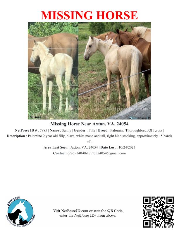 Description: Filly is not in pasture with the other horses and there is no sign of her anywhere. Fences are all up, no places where she could have gotten out. Neighbors have not seen any sign of her.