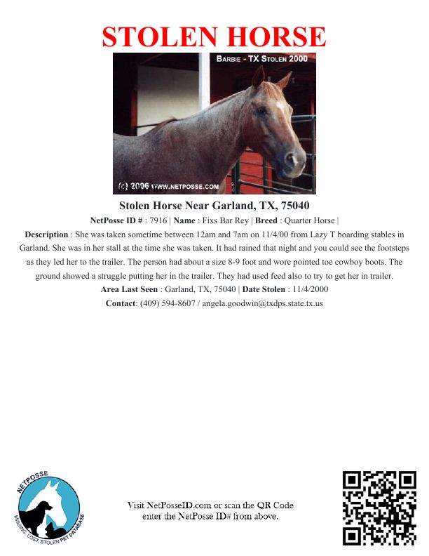 Description: She was taken sometime between 12am and 7am on 11/4/00 from Lazy T boarding stables in Garland. She was in her stall at the time she was taken. It had rained that night and you could see the footsteps as they led her to the trailer. The person had about a size 8-9 foot and wore pointed toe cowboy boots. The ground showed a struggle putting her in the trailer. They had used feed also to try to get her in trailer.