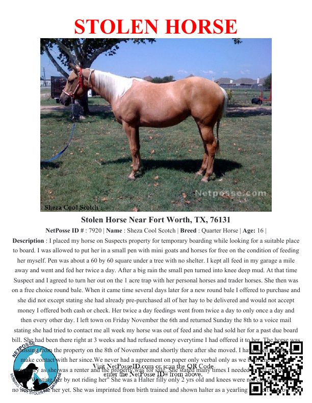 Description: I placed my horse on Suspects property for temporary boarding while looking for a suitable place to board. I was allowed to put her in a small pen with mini goats and horses for free on the condition of feeding her myself. Pen was about a 60 by 60 square under a tree with no shelter. I kept all feed in my garage a mile away and went and fed her twice a day. After a big rain the small pen turned into knee deep mud. At that time Suspect and I agreed to turn her out on the 1 acre trap with her personal horses and trader horses. She then was on a free choice round bale. When it came time several days later for a new round bale I offered to purchase and she did not except stating she had already pre-purchased all of her hay to be delivered and would not accept money I offered both cash or check. Her twice a day feedings went from twice a day to only once a day and then every other day. I left town on Friday November the 6th and returned Sunday the 8th to a voice mail stating she had tried to contact me all week my horse was out of feed and she had sold her for a past due board bill. She had been there right at 3 weeks and had refused money everytime I had offered it to her. The horse was missing from the property on the 8th of November and shortly there after she moved. I have been unable to make contact with her since.We never had a agreement on paper only verbal only as we both knew it was temporary as she was a renter and the property was for sale. She stated many times I needed to sell my horse as I was "Wasting her by not riding her" She was a Halter filly only 2 yrs old and knees were not closed there was no need to ride her yet. She was imprinted from birth trained and shown halter as a yearling and left to grow her 2 year old year. She asked me to price her multiple times as she was getting nerved at all the passer buys that would stop to inquire about the beautiful yellow filly in the pasture. I explained she was not for sale and money could not buy her as I was well over $17k into her and she was irreplaceable being the last yellow filly out of a deceased WC Sire.
