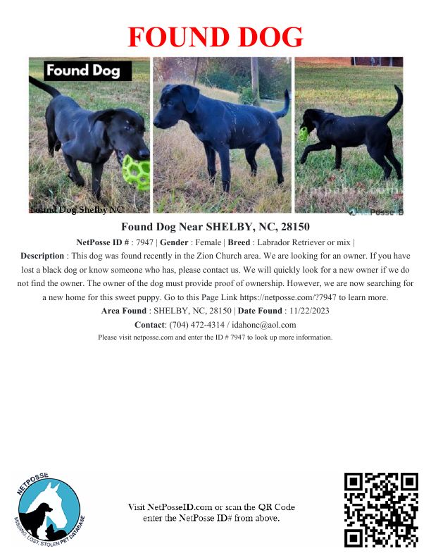 Description: This dog was found recently in Cleveland County, NC's Zion Church / Metcalfe Community. We are looking for an owner. If you have lost a black Lab-type dog or know someone who has, please contact us. We will quickly look for a new owner if we do not find the owner. The owner must describe the dog and prove ownership. Some things are missing in the picture.