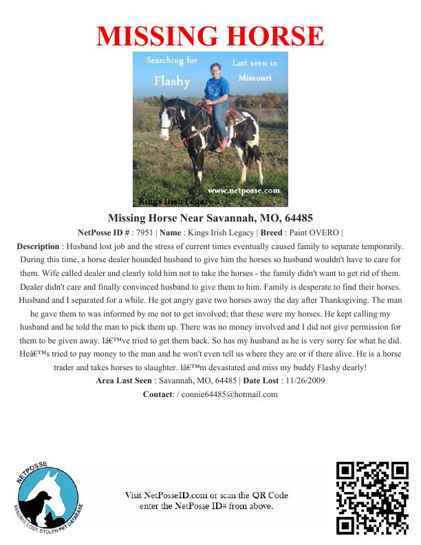 Description: Husband lost job and the stress of current times eventually caused family to separate temporarily. During this time, a horse dealer hounded husband to give him the horses so husband wouldn't have to care for them. Wife called dealer and clearly told him not to take the horses - the family didn't want to get rid of them. Dealer didn't care and finally convinced husband to give them to him. Family is desperate to find their horses. Husband and I separated for a while. He got angry gave two horses away the day after Thanksgiving. The man he gave them to was informed by me not to get involved; that these were my horses. He kept calling my husband and he told the man to pick them up. There was no money involved and I did not give permission for them to be given away. I’ve tried to get them back. So has my husband as he is very sorry for what he did. He’s tried to pay money to the man and he won't even tell us where they are or if there alive. He is a horse trader and takes horses to slaughter. I’m devastated and miss my buddy Flashy dearly!