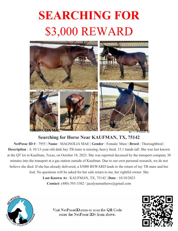 Description: Please help me locate my missing TB mare, lot number 890. She is a 10-13-year-old dark bay mare, heavy bred, 15.1 hands tall. She was last known at the QT lot in Kaufman, Texas, on October 18, 2023, and picked up by a transport company on October 10, 2023. I was told a vet was out Monday the 16th for transport on October 18. The mare was to be delivered to Arizona on October 19th-20th but did not arrive. She may have been delivered to someone else in Arizona, California, or Texas, the said route of the transport company, or resold anywhere. She was reported deceased by the transport company 30 minutes into the transport at a gas station outside of Kaufman. Due to our own personal research, we do not believe she died. If she has already delivered, a $3000 REWARD leads to the return of my TB mare and her foal. No questions will be asked for her safe return to me, her rightful owner. She may be in her third trimester, due in February 2024.