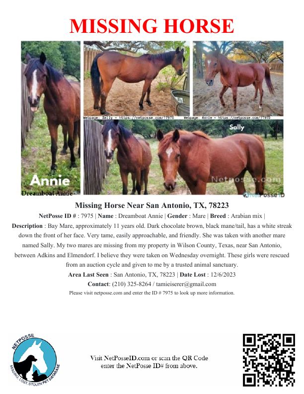 Description: A pair of bonded mares were taken from their pasture overnight on 12/6/23. Someone cut the fence and walked them out from the top of my driveway in a spot they like to hang out in. There is an open police report in Wilson County, TX. My two mares were stolen from my property in Wilson County, Texas, near San Antonio, between Adkins and Elmendorf. They were taken on Wednesday overnight. These girls were rescued from an auction cycle and given to me by a trusted animal sanctuary, Bay Mare, at approximately 11 years old. Dark chocolate brown, black mane/tail, has a white streak down the front of her face. Very tame, easily approachable, and friendly. She was taken with another mare named Sally. Wilson County Sherrif's Office case number 23-024733 Phone: (830) 393-2535