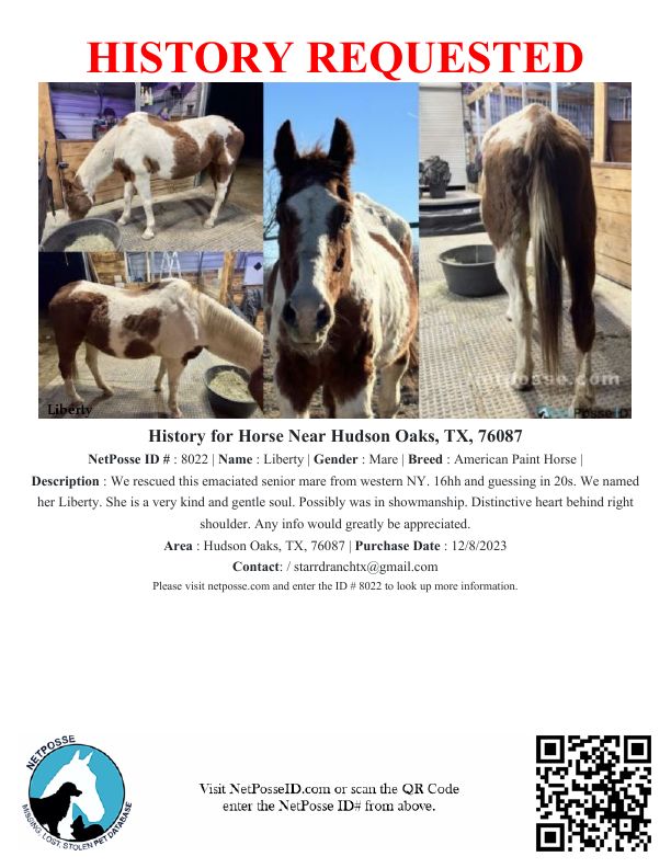 Description: Name/Registered Name and history please. We rescued this emaciated senior mare from western NY. 16hh and guessing in 20s. We named her Liberty. She is a very kind and gentle soul. Possibly was in showmanship. Fast learner. Distinctive heart behind right shoulder. Any info would greatly be appreciated.