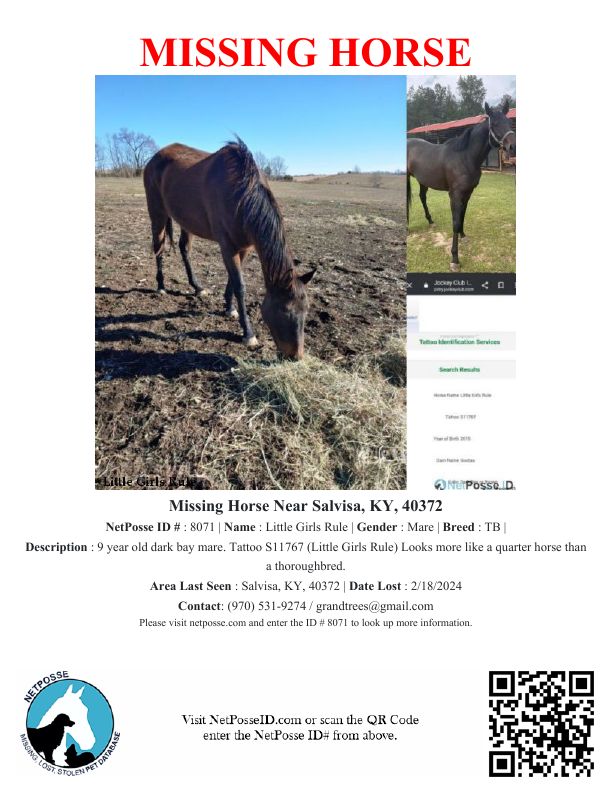 Was in pasture with 8 other horses. She did not come in to eat with herd. No tracks or sign by any of the gates. Entire property was searched. She is tattooed on upper lip S11767.