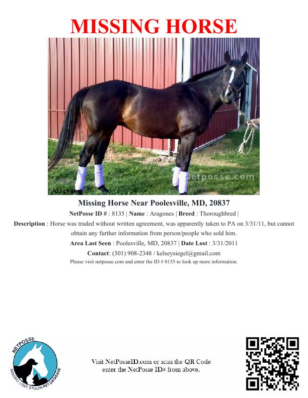 Description: Horse was traded without written agreement, was apparently taken to PA on 3/31/11, but cannot obtain any further information from person/people who sold him.