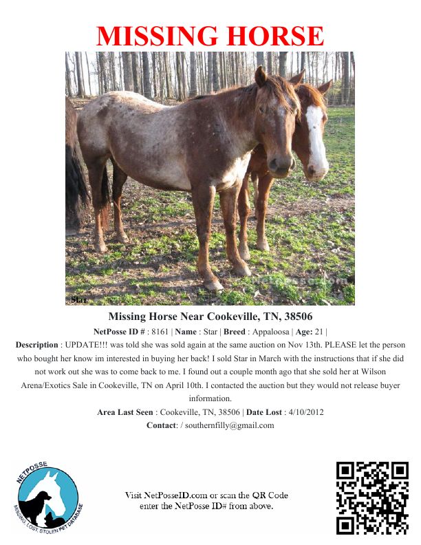 Description: UPDATE!!! was told she was sold again at the same auction on Nov 13th. PLEASE let the person who bought her know im interested in buying her back! I sold Star in March with the instructions that if she did not work out she was to come back to me. I found out a couple month ago that she sold her at Wilson Arena/Exotics Sale in Cookeville, TN on April 10th. I contacted the auction but they would not release buyer information.