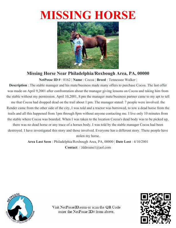 The manager stated: 7 people were involved. the Render came from the other side of the city, I was told and a tractor was borrowed, to tow a dead horse from the trails and all this happened from 1pm through 8pm without anyone contacting me. I live only 10 minutes from the stable where Cocoa was boarded. When I was taken to the location Cocoa's dead body was to be picked up, there was no dead horse or any trace of a horses body. I was told by the stable manager Cocoa had been destroyed. I have investigated this story and those involved. Everyone has a different story. These people have stolen my horse.