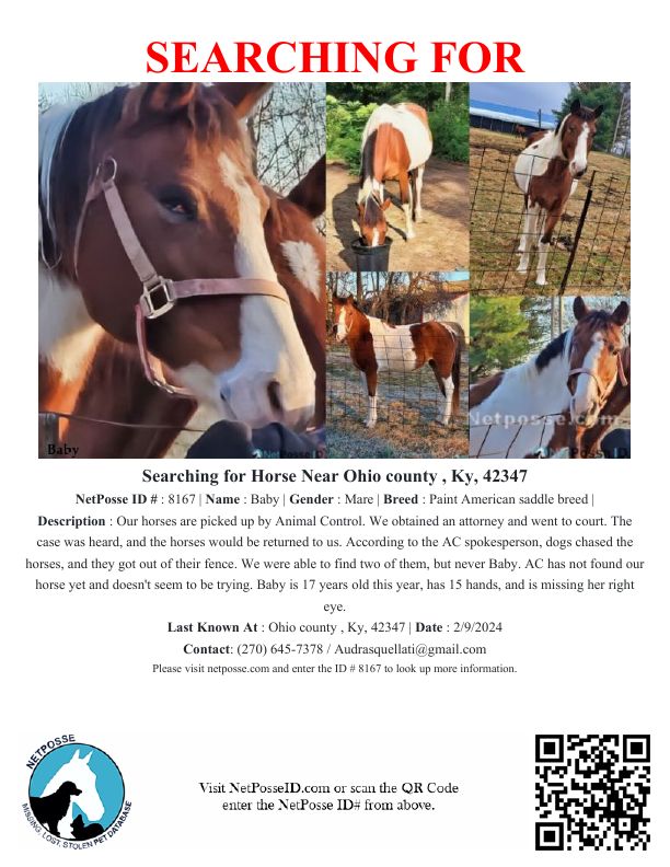 Description: This is a complicated case. Animal Control picked up our horses with a seizure warrant. Once that happened, they claimed we did not meet the standards of care, like food and clean water and the condition of the horses, so they kept our horses. We obtained an attorney and went to court. The case was heard, and the horses were to be given back to us. According to the AC spokesperson, dogs chased the horses and they got out of their fence. We were able to find two of them, but never Baby. Baby is 17 years old this year, has 15 hands, and is missing her right eye.