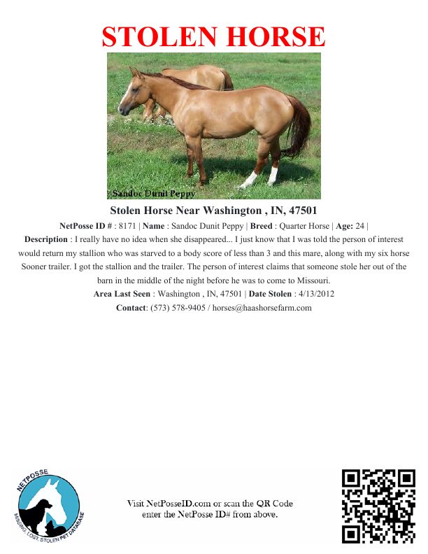Description: I really have no idea when she disappeared... I just know that I was told the person of interest would return my stallion who was starved to a body score of less than 3 and this mare, along with my six horse Sooner trailer. I got the stallion and the trailer. The person of interest claims that someone stole her out of the barn in the middle of the night before he was to come to Missouri.