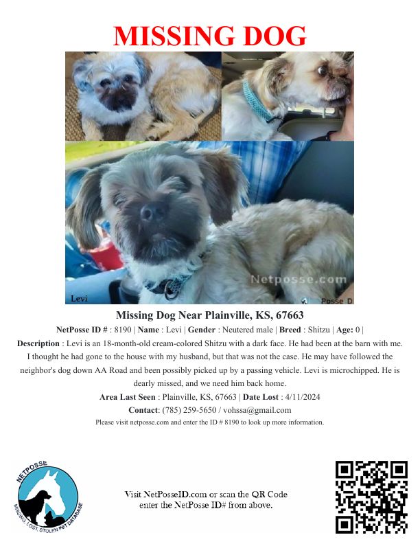 Description: Levi had been at the barn with me. I thought he had gone to the house with my husband, but that was not the case. He may have followed the neighbor's dog down AA Road and been picked up by a passing vehicle. Levi is microchipped. He is dearly missed, and we need him back home. Levi is an 18-month-old cream-colored Shitzu with a dark face.