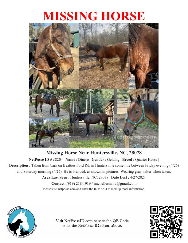 Description: Taken from barn on Beatties Ford Rd. in Huntersville sometime between Friday evening (4/26) and Saturday morning (4/27). He is branded, as shown in pictures. Wearing gray halter when taken. He is gentle, & stands at about 15hh.