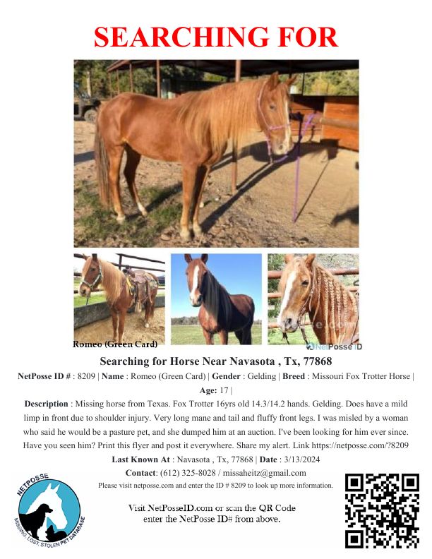 Description: His name was changed to Green Card. (I called him Romeo). He was given to a woman who lied about her intentions when I said he could only be a pasture pet due to a bad shoulder. She dumped him at auction 30min after we left early March in Texas. Ive been looking for him since. I tracked him to 7 auctions/kill pens and always too late when i find him. Gelding, sent thru auctions as a 10yr old (he is actually 16yrs) 14.3h gaited fox trotter but may have been misrepresented as a QH beginner safe ranch horse. He is not sound.