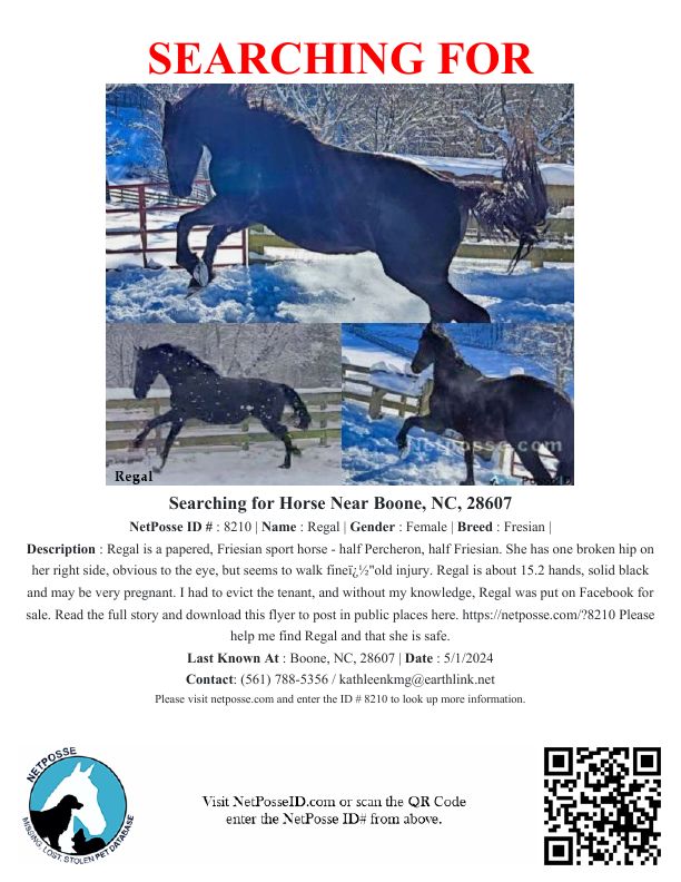 Description: I am 1/2 owner of this beautiful black half Fresian/half Percheron, and I have all proofs of purchase and of 1/2 payment of all costs of ownership. Unfortunately, I had to start eviction proceedings against my tenant, the other 1/2 owner. While the matter was under appeal, and without my knowledge, she put Regal up for sale on facebook, and Regal is no longer at the property. The tenant and her family apparently moved out. On social media, one of her daughters wrote that they gave two of the horses to a rescue. The other horse is a Wild Mustang, that I own and have the bill of sale for, and who I named Cherokee. But, to date, no local rescues know of their whereabouts. The eviction proceeding was filed in Watauga County, NC at file number: 24 CVM 66.
