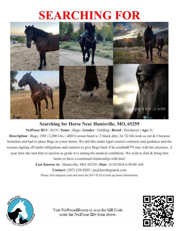 In '22 life took us out & I became homeless and had to place Bugs in a new home. We did this under legal counsel contracts and guidance and the woman signing off under obligations and contract to give Bugs back if he couldn’t stay with her anymore. A year later she sent him to auction at the Boone County Missouri sale as a grade driving horse w/o stating his medical conditions March 2024. The auction and woman have hid his whereabouts from us and we are still heartbroken and searching to find him. We wish to find & bring him home. Please help us bring him home.