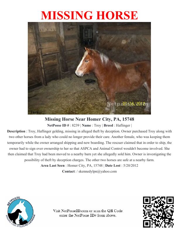 Description: Troy, Haflinger gelding, missing in alleged theft by deception. Owner purchased Troy along with two other horses from a lady who could no longer provide their care. Another female, who was keeping them temporarily while the owner arranged shipping and new boarding. The rescuer claimed that in order to ship, the owner had to sign over ownership to her so that ASPCA and Animal Control wouldn't become involved. She then claimed that Troy had been moved to a nearby barn yet she allegedly sold him. Owner is investigating the possibility of theft by deception charges. The other two horses are safe at a nearby farm.