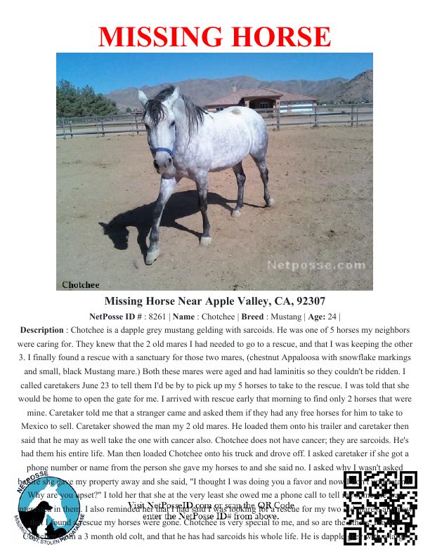 Description: Chotchee is a dapple grey mustang gelding with sarcoids. He was one of 5 horses my neighbors were caring for. They knew that the 2 old mares I had needed to go to a rescue, and that I was keeping the other 3. I finally found a rescue with a sanctuary for those two mares, (chestnut Appaloosa with snowflake markings and small, black Mustang mare.) Both these mares were aged and had laminitis so they couldn't be ridden. I called caretakers June 23 to tell them I'd be by to pick up my 5 horses to take to the rescue. I was told that she would be home to open the gate for me. I arrived with rescue early that morning to find only 2 horses that were mine. Caretaker told me that a stranger came and asked them if they had any free horses for him to take to Mexico to sell. Caretaker showed the man my 2 old mares. He loaded them onto his trailer and caretaker then said that he may as well take the one with cancer also. Chotchee does not have cancer; they are sarcoids. He's had them his entire life. Man then loaded Chotchee onto his truck and drove off. I asked caretaker if she got a phone number or name from the person she gave my horses to and she said no. I asked why I wasn't asked before she gave my property away and she said, "I thought I was doing you a favor and now I don't understand. Why are you upset?" I told her that she at the very least she owed me a phone call to tell me someone was interested in them. I also reminded her that I had said I was looking for a rescue for my two old mares, and now that I found a rescue my horses were gone. Chotchee is very special to me, and so are the others. I raised Chotchee from a 3 month old colt, and that he has had sarcoids his whole life. He is dapple grey with a large sarcoid on his left hip. He can't be ridden due to sarcoid behind his withers on his back.