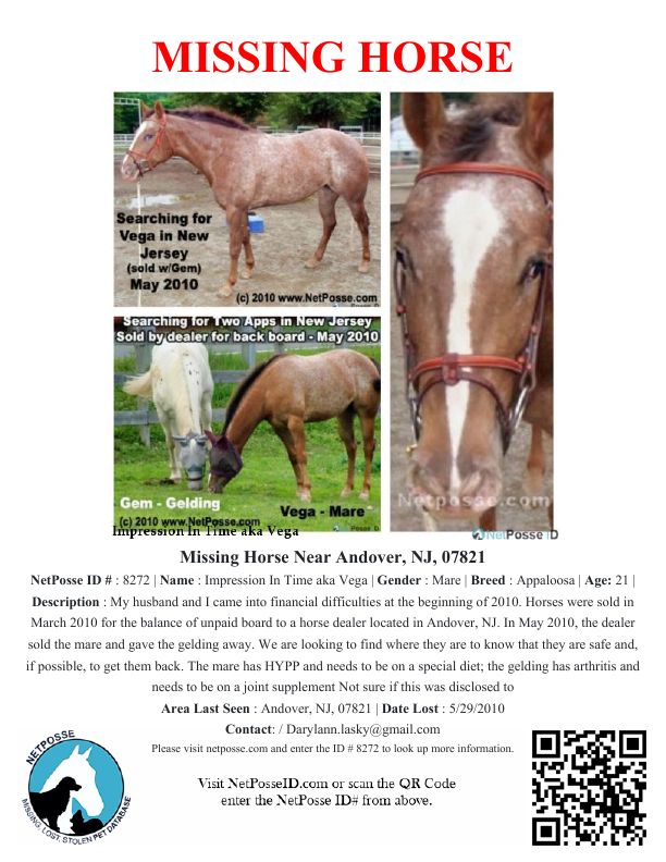 Description: COLD CASE: My husband and I faced financial difficulties at the beginning of 2010. Horses were sold in March 2010 for the balance of unpaid board to a horse dealer located in Andover, NJ. In May 2010, the dealer sold the mare and gave the gelding away. We are looking to find where they are to know that they are safe and, if possible, to get them back. The mare has HYPP and needs to be on a special diet; the gelding has arthritis and needs to be on a joint supplement. Not sure if this was disclosed to new owners.
