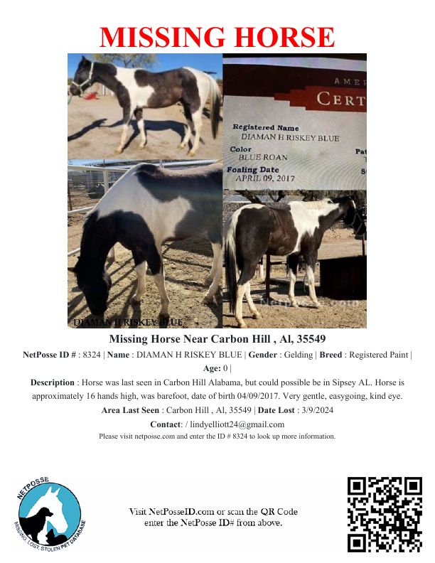Description: Horse was brought to farm for a prospective buyer. Horse was last seen in Carbon Hill Alabama. Gelding, approximately 16H, DOB 04/07/2017.