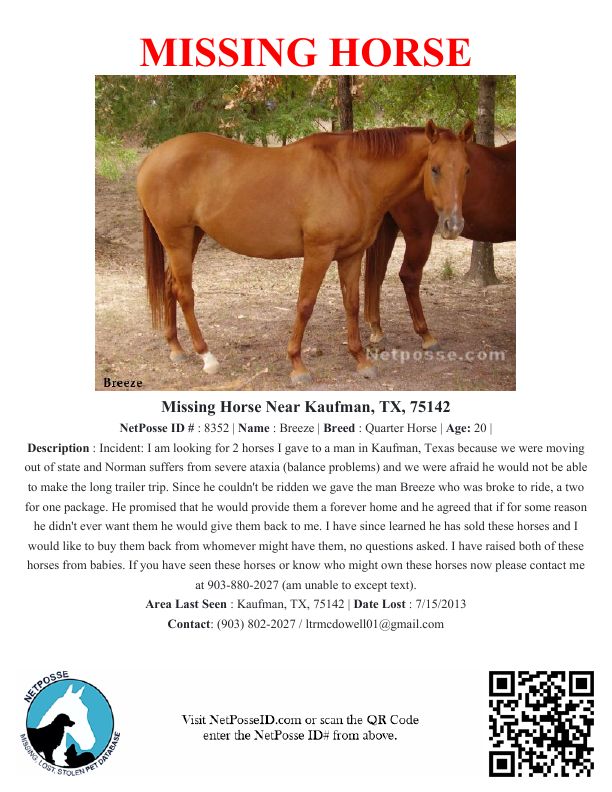 Description: Incident: I am looking for 2 horses I gave to a man in Kaufman, Texas because we were moving out of state and Norman suffers from severe ataxia (balance problems) and we were afraid he would not be able to make the long trailer trip. Since he couldn't be ridden we gave the man Breeze who was broke to ride, a two for one package. He promised that he would provide them a forever home and he agreed that if for some reason he didn't ever want them he would give them back to me. I have since learned he has sold these horses and I would like to buy them back from whomever might have them, no questions asked. I have raised both of these horses from babies. If you have seen these horses or know who might own these horses now please contact me at 903-880-2027 (am unable to except text).