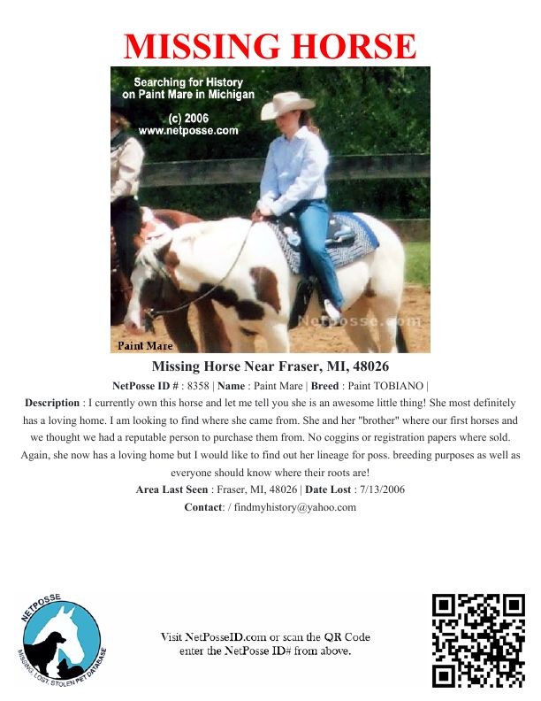 Description: I currently own this horse and let me tell you she is an awesome little thing! She most definitely has a loving home. I am looking to find where she came from. She and her "brother" where our first horses and we thought we had a reputable person to purchase them from. No coggins or registration papers where sold. Again, she now has a loving home but I would like to find out her lineage for poss. breeding purposes as well as everyone should know where their roots are!