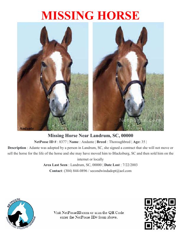 Description: Adante was adopted by a person in Landrum, SC, she signed a contract that she will not move or sell the horse for the life of the horse and she may have moved him to Blacksburg, SC and then sold him on the internet or locally