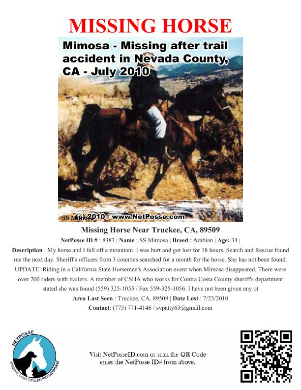 Description: My horse and I fell off a mountain. I was hurt and got lost for 18 hours. Search and Rescue found me the next day. Sheriff's officers from 3 counties searched for a month for the horse. She has not been found.