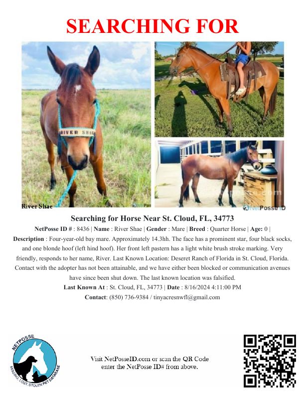 Description: Adopter breached the adoption contract and moved the adopted horse (River Shae) to an unknown location out of her care. Adopter has blocked all lines of communication. The last known location of River is in Shae is Deseret Ranch of Florida in St. Cloud, Florida. The same adopter has also abandoned a second adopted equine of ours at this location, which has since been safely recovered. River Shae's whereabouts and welfare are still unknown.
