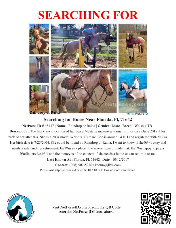 Hello everyone! I’m hoping someone in here can help me locate a pony. I’m looking for my first pony, who, long story short, was supposed to have been sold to a “forever” home. I have tracked her from my SC to somewhere in Florida. Her last known location was with Joe Williams for training in 2018, although I am unsure how long she stayed. I have reached out to him but have not heard back. I have heard she was sold and maybe somewhere in the Ocala area.