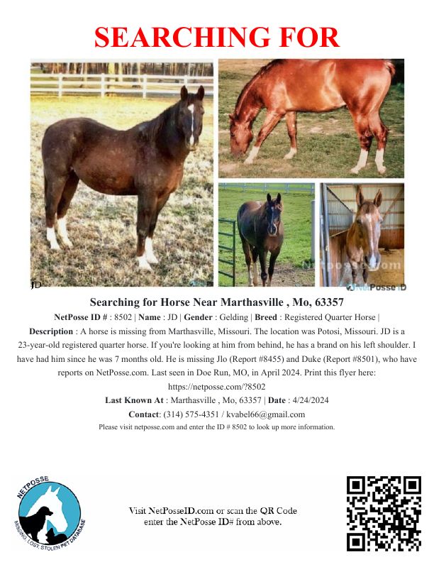 Description: Have you seen JD? Registered Name is JD Driften Blunder. Have you seen J LO? She is still missing from Warren County, MO! She was last seen in Doe Run, MO, in April 2024, along with two other horses, Duke and JD. These are my babies of 25 years. CONTACT us if you have any information on their whereabouts. They were supposed to go to a therapy place in Farmington, MO, but they never did. The woman sold them on the black market.
