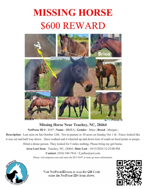 Description: Teachey NC near Wallace NC . 45 minutes north of Wilmington NC 2 hours from Myrtle Beach. Not a poop or hoof tracks anywhere . Fence was half way down. Hired a drone in Sunday . Nothing in a 5 mile search .