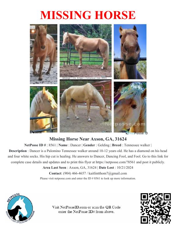 Share Dancer's NetPosse Alert on Facebook by clicking this link. https://www.facebook.com/StolenHorseInternationalNetPosse/posts/pfbid02yp1PjBnr9un9hvD7g2bzEMoZ6aKv4Fo3Zw1MnohAa7ediwQVmCeU9Z5LenUryXtEl