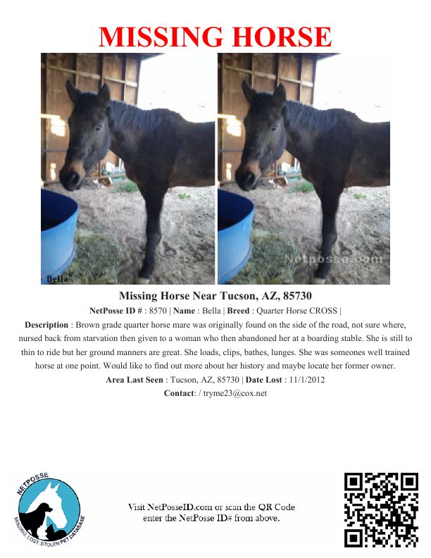 Description: Brown grade quarter horse mare was originally found on the side of the road, not sure where, nursed back from starvation then given to a woman who then abandoned her at a boarding stable. She is still to thin to ride but her ground manners are great. She loads, clips, bathes, lunges. She was someones well trained horse at one point. Would like to find out more about her history and maybe locate her former owner.