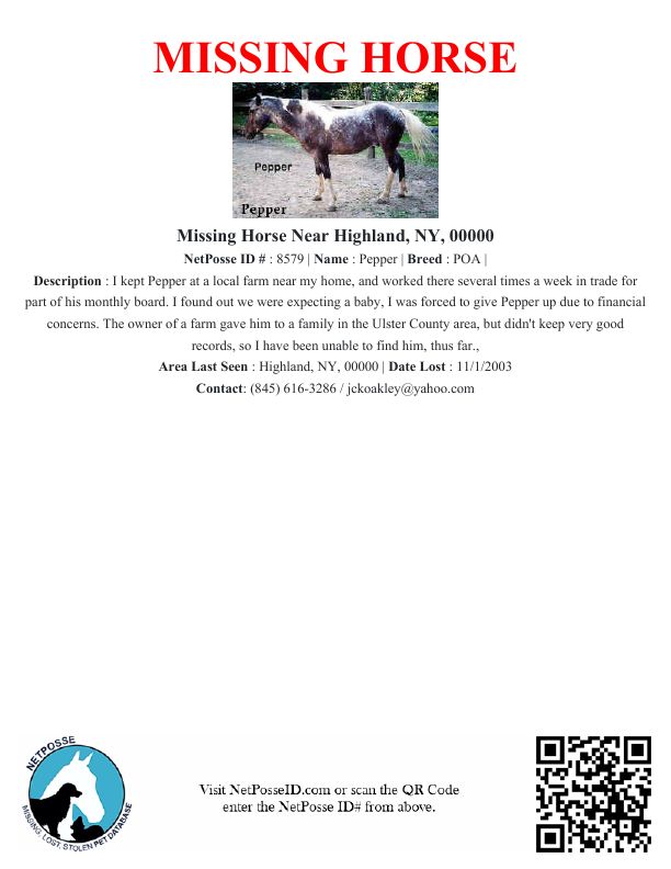 Description: I kept Pepper at a local farm near my home, and worked there several times a week in trade for part of his monthly board. I found out we were expecting a baby, I was forced to give Pepper up due to financial concerns. The owner of a farm gave him to a family in the Ulster County area, but didn't keep very good records, so I have been unable to find him, thus far.,