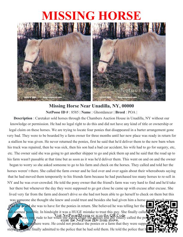 Description: Caretaker sold horses through the Chambers Auction House in Unadilla, NY without our knowledge or permission. He had no legal right to do this and did not have any kind of title or ownership or legal claim on these horses. We are trying to locate four ponies that disappeared in a barter arrangement gone very bad. They were to be boarded by a farm owner for three months until her new place was ready in return for a stallion he was given. He never returned the ponies, first he said that he'd deliver them to the new barn when his truck was repaired, then he was sick, then his son had a bad car accident, his wife had to go for surgery, etc, etc. The owner said she was going to get another shipper to go and pick them up and he said that the road up to his farm wasn't passable at that time but as soon as it was he'd deliver them. This went on and on and the owner began to worry so she asked someone to go to his farm and check on the horses. They called and told her the horses weren' t there. She called the farm owner and he lied over and over again about their whereabouts saying that he had moved them temporarily to his friends farm because he had purchased too many horses to re-sell in NY and he was over-crowded. He told the pony owner that the friend's farm was very hard to find and he'd take her there but whenever the day they were supposed to go got close he came up with excuse after excuse. She lived very far from the farm and doesn't drive so she had not been able to go herself to check on them but this was someone she thought she knew and could trust and besides she had given him a horse worth much more than the board she was to have for the ponies in return. She believed he was telling her the truth. At the time it all seemed possible. In hindsight it was a HUGE mistake to trust this guy. She finally called one morning and his wife was very rude to her when she asked about the ponies and she finally called the police to go over and find out where there were. He could not produce the ponies or a farm that they were supposed to have been staying at so he finally admitted to the police that he had sold them. He told the police that he had sold them for back board owed. He was NOT owed any board he had bartered the board for the horse he was given and there is a truckload of evidence proving this.