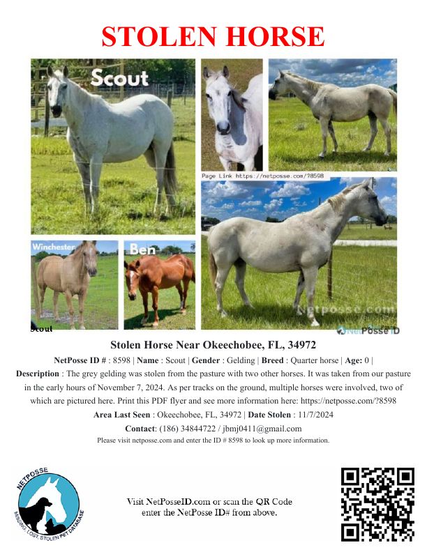 Horses were taken from our pasture in the early hours of November 7, 2024. As per tracks on the ground, multiple horses were involved, two of which are pictured here. Print this PDF flyer and see more information here: Scout - https://netposse.com/?8598 Winchester - https://netposse.com/?8597 Ben - https://netposse.com/?8620