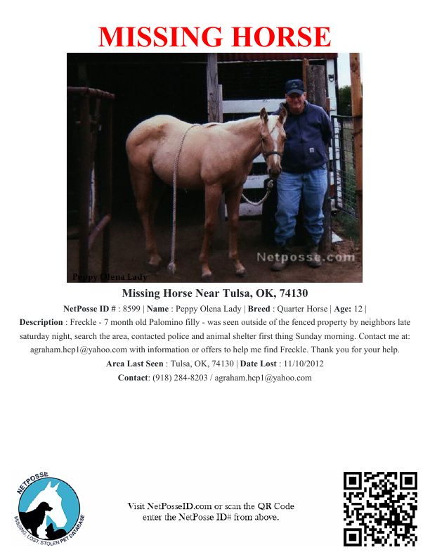 Description: Freckle - 7 month old Palomino filly - was seen outside of the fenced property by neighbors late saturday night, search the area, contacted police and animal shelter first thing Sunday morning. Contact me at: agraham.hcp1@yahoo.com with information or offers to help me find Freckle. Thank you for your help.
