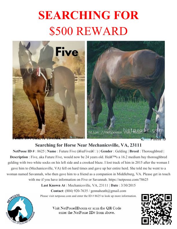 I lost track of him in 2015 after the woman I gave him to a woman fell on hard times. She claimed that her father re-homed Five as well as her other horses in her herd to a woman named Savannah. This Savannah person gave Five to a friend in Middleburg as a companion horse.