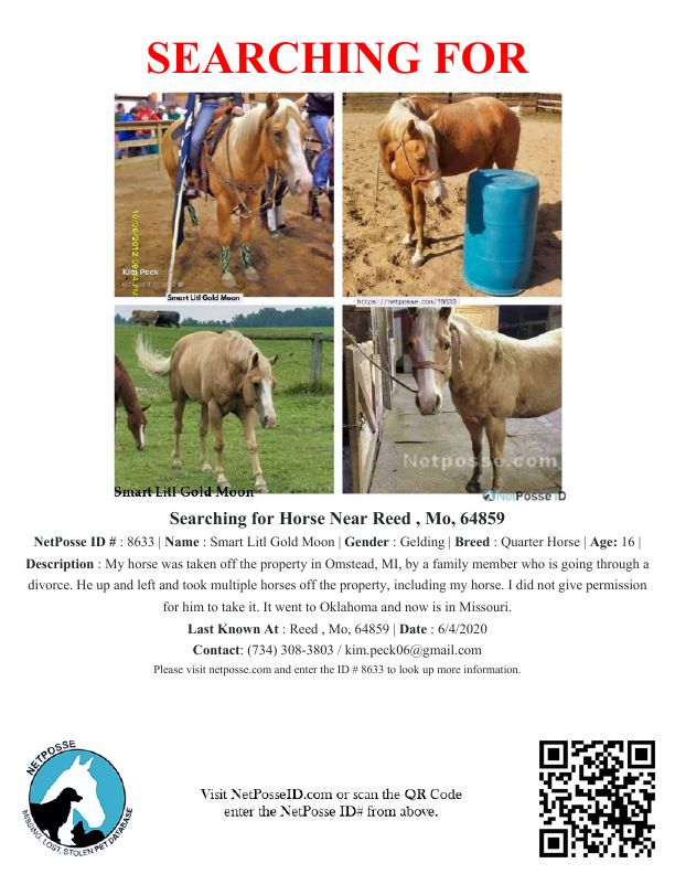 Description: My horse was taken off property in Omstead, MI by a family member who is going through a divorce. He up and left and took multiple horses off the property including my horse. I did not give permission for him to take.