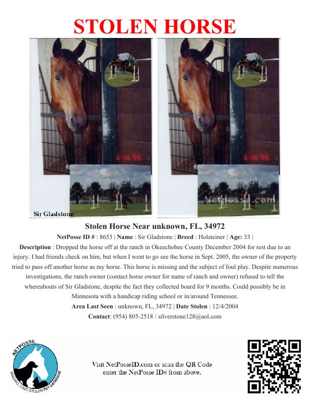 This horse is missing and the subject of foul play. Despite numerous investigations, the ranch owner (contact horse owner for name of ranch and owner) refused to tell the whereabouts of Sir Gladstone, despite the fact they collected board for 9 months. Could possibly be in Minnesota with a handicap riding school or in/around Tennessee.