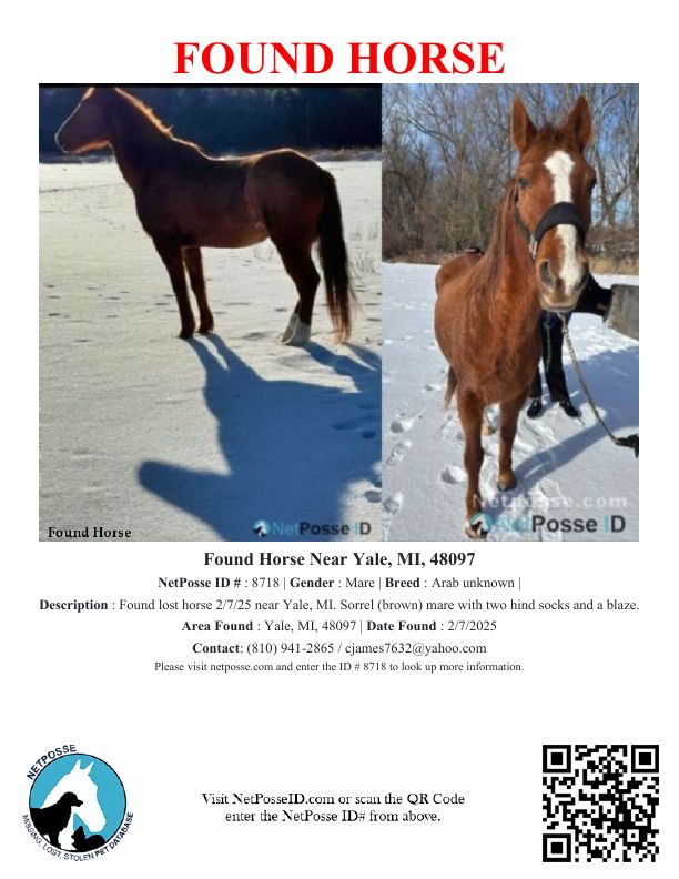 Description: Found East of Yale, MI without a halter on. Crossroads were Yale rd and Bricker Rd. Approx 14.2hh tall, older, mare.