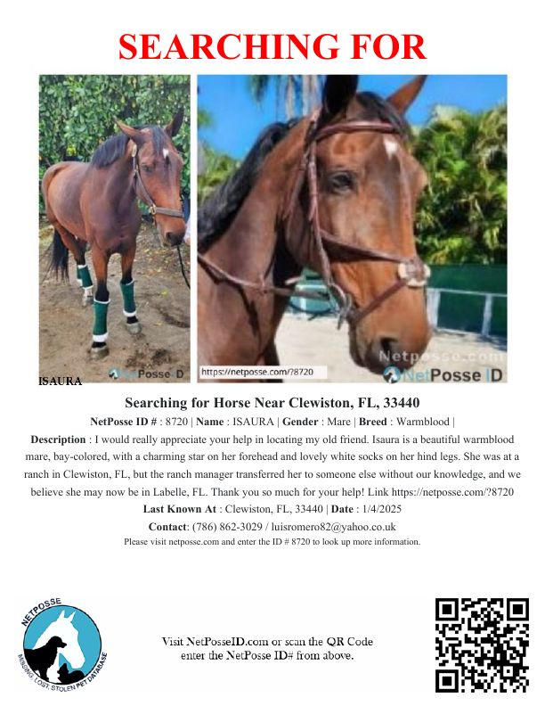 Description: I would really appreciate your help in locating my old friend. Isaura is a beautiful warmblood mare, bay-colored, with a charming star on her forehead and lovely white socks on her hind legs. She was at a ranch in Clewiston, FL, but the ranch manager transferred her to someone else without our knowledge, and we believe she may now be in Labelle, FL. Thank you so much for your help!