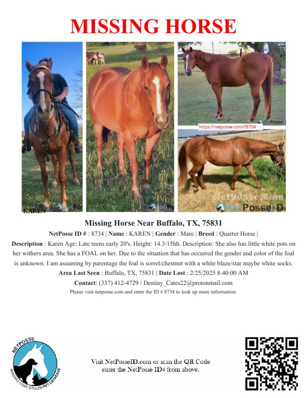 Description: This is a horse boarders absolute nightmare come true...Due to the negligence of people and them not paying attention and them not being honest my very much loved horses are LOST or even STOLEN and I recently found out that they have been LOST (possibly STOLEN) FOR A MONTH NOW (BEEN OUT OF TOWN ON BUSINESS)!! My heart is absolutely broken and I'm devastated. They were last seen running around on 989 FM 489, BUFFALO, TX 75831 possibly down that road near the gas well.