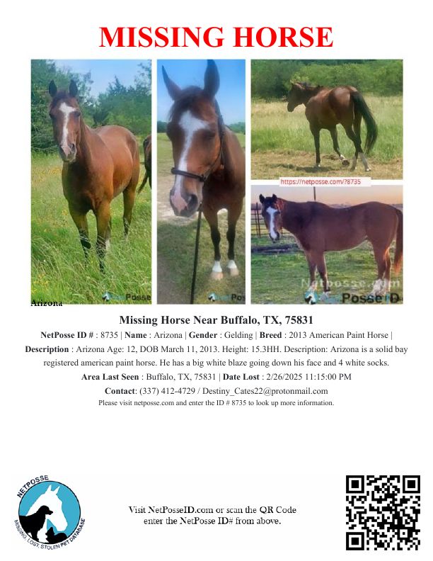 Description: This is a horse boarders absolute nightmare come true...Due to the negligence of people and them not paying attention and them not being honest my very much loved horses are LOST or even STOLEN and I recently found out that they have been LOST (possibly STOLEN) FOR A MONTH NOW (BEEN OUT OF TOWN ON BUSINESS)!! My heart is absolutely broken and I'm devastated. They were last seen running around on 989 FM 489, BUFFALO, TX 75831 possibly down that road near the gas well.