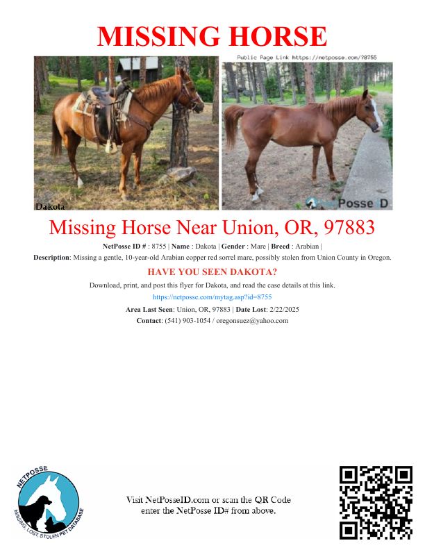 Description: Our mare is about 10 years old, approx. 15 hands, Arabian copper red sorrel with white blaze & 2 white socks. She is very friendly & loads easily. She was possibly stolen from off of the ranch in Union, Oregon. The rest of her herd was not taken as they're hard to catch.