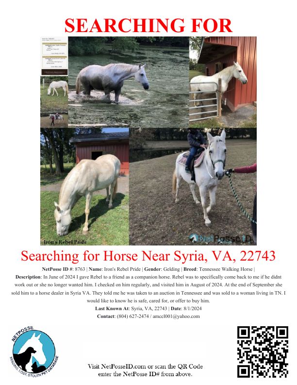 Description: In June of 2024 I gave Rebel to a friend as a companion horse. Rebel was to specifically come back to me if he didn’t work out or she no longer wanted him. I checked on him regularly, and visited him in August of 2024. At the end of September she sold him to a horse dealer in Syria VA. They told me he was taken to an auction in Tennessee and was sold to a woman living in TN. I would like to know he is safe, cared for, or offer to buy him.