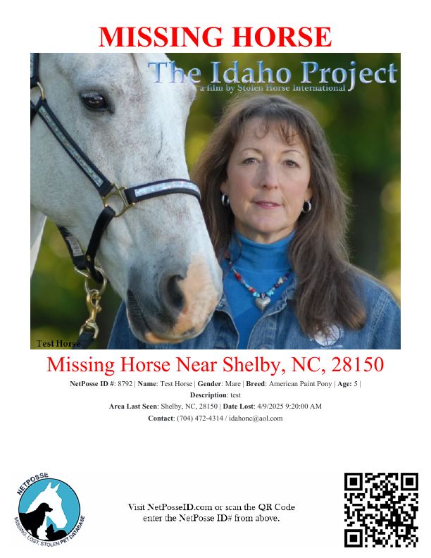 Name: Test Horse Gender: Mare Species: Horse Breed: American Paint Pony Description: test Area Last Seen: Shelby, NC, 28150 Date Lost: 4/9/2025 9:20:00 AM Contact / Submit Tip