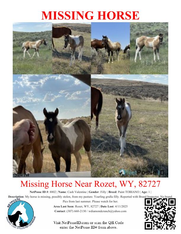 Description: My horse is missing, possibly stolen, from my pasture. Yearling grulla filly. Reported with Brand Inspector. No brand. Pics from last summer. No public access to our property but neighbors have thousands of acres with active oilfield and cattle operations so opportunities are vast and unobstructed. Please watch for her.