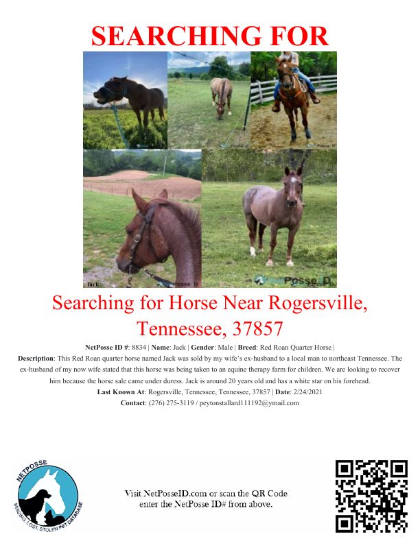 Description: This Red Roan quarter horse named Jack was sold by my wife’s ex-husband to a local man to northeast Tennessee. The ex-husband of my now wife stated that this horse was being taken to an equine therapy farm for children. We are looking to recover him because the horse sale came under duress.
