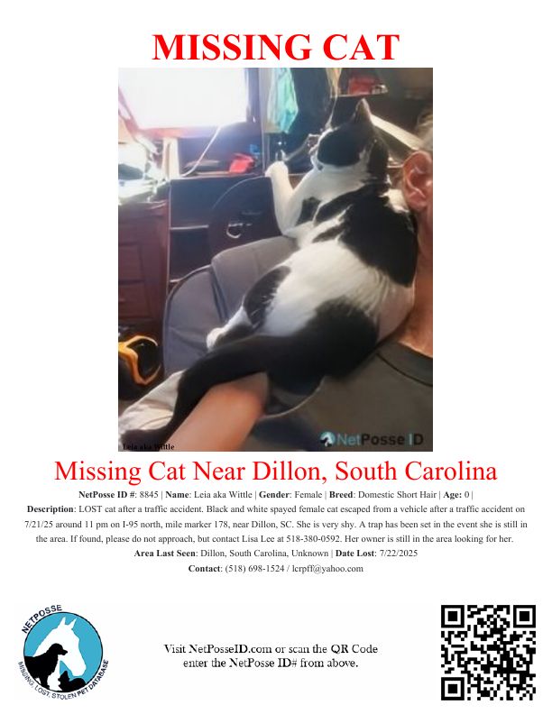 Lost around 11pm on 7-21-2025, Leia, black and white domestic shorthair cat. She escaped from the vehicle after a traffic accident at mile maker 178 on I95 northbound in the Dillon/Latta South Carolina area.